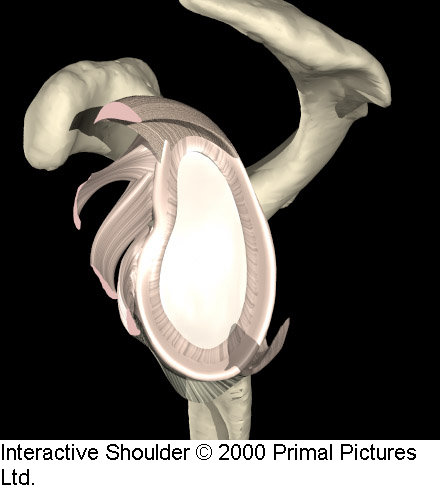 A cabeça, ou bola, de seu osso do braço se encaixa em um soquete raso na glenóide . Tecido conjuntivo forte , chamada de cápsula do ombro , é o sistema de ligamento do ombro e mantém a cabeça do osso do braço centrada na cavidade da glenóide .